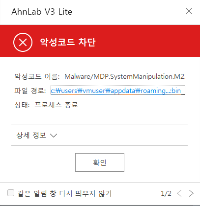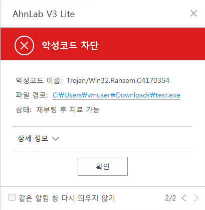 안랩 V3 제품군에서는 위 유형의 악성코드를 다음과 같이 탐지하고 있다.