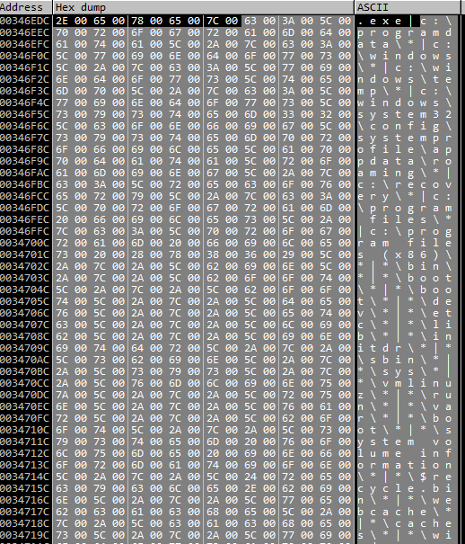 *\$recycle.bin* | *\appdata* | *\bin* | *\boot* | *\caches* | *\dev* | *\etc* | *\initdr* | *\lib* | *\programdata* | *\run* | *\sbin* | *\sys* | *\system volume information* | *\users\all users* | *\var* | *\vmlinuz* | *\webcache* | *\windowsapps* | c:\program files (x86)* | c:\program files* | c:\programdata* | c:\recovery* | c:\windows* | c:\users\ %USERNAME%\appdata\local\temp* | c:\users\ %USERNAME%\appdata\roaming*