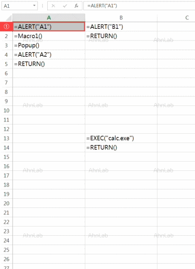 엑셀 4.0 XLM 매크로 코드의 분기 방식을 상세히 이해하기 위해 예시로 만든 매크로 시트로 설명한다. 사용자 눈에 보이는 매크로 함수는 “A1”, “A2”, “B1” 메시지를 띄우는 다이얼로그 박스와 EXEC을 통해 실행되는 계산기(calc.exe)이다. 총 2개의 열에 엑셀 매크로 코드가 있고 행 중간에는 아무 수식도 없는 셀도 있다. 이때 실행 흐름 순서는 다음과 같다.