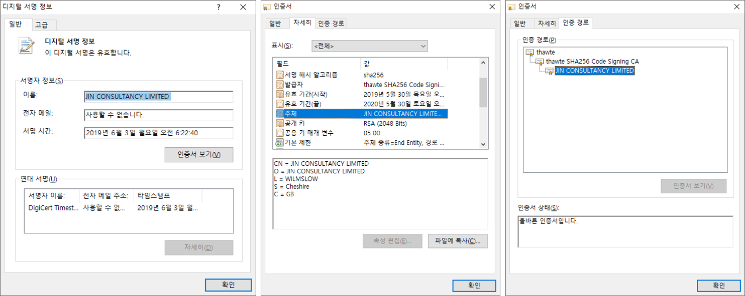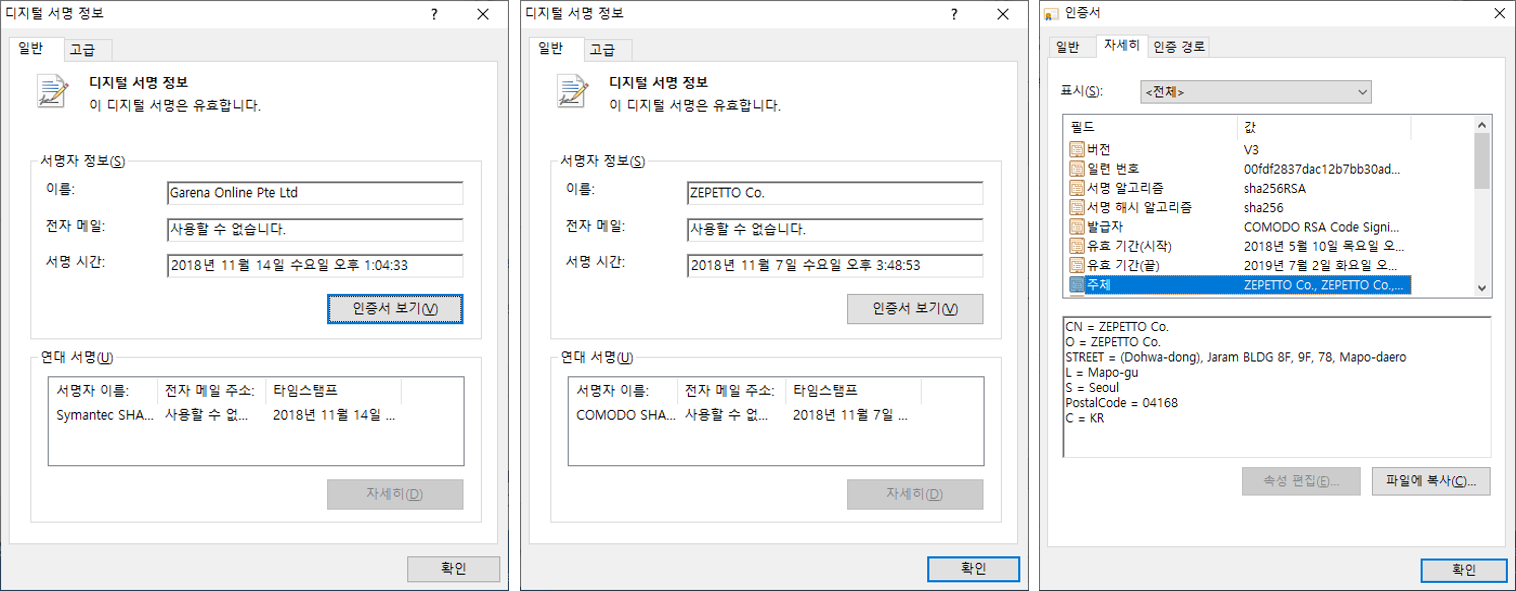 안랩에서는 Clop 랜섬웨어 추적 단계에서 백도어 파일을 다운받는 파일, Ammyy 백도어 파일, 그리고 Clop 랜섬웨어 파일까지 총 3단계의 주요 PE 실행 파일이 코드 서명된 것을 확인하였다. 서명에 이용된 디지털 인증서는 파일의 기능마다 인증서 정보를 달리한 것이 아닌 다양한 인증서가 파일마다 혼재되어 이용되었다. 다운로더부터 랜섬웨어까지 모두 동일한 공격자가 파일을 제작하여 유포하고 있는 것임을 알 수 있다.