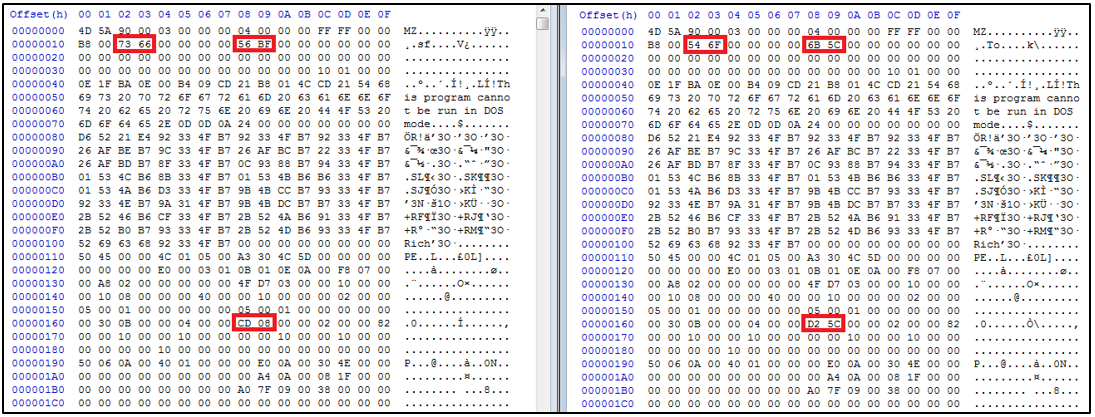 그리고 FlawedAmmyy 백도어를 디코딩하고 생성할 때 마다 아래와 같이 PE 헤더의 특정 부분을 랜덤하게 생성하기 때문에 설치될 때 마다 다른 Hash 값을 가지게 되며, 이에 따라 동일한 인증서로 서명되어 있지만 유효하지 않는 것으로 확인된다.