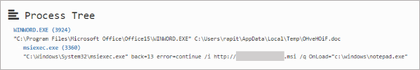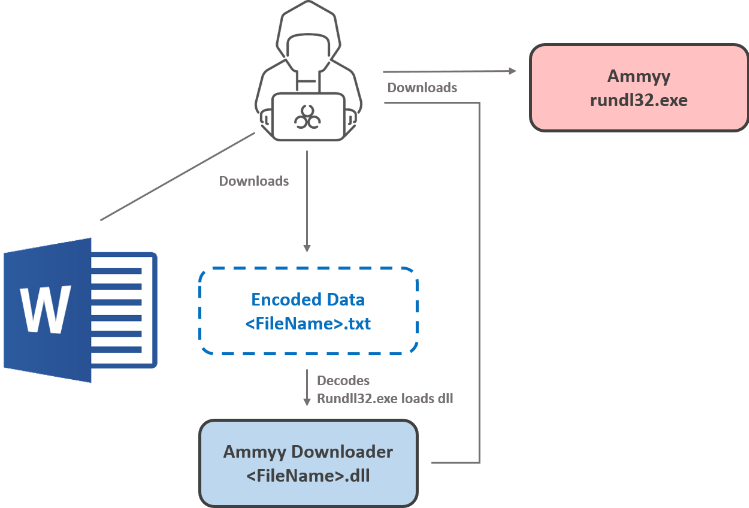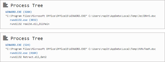 워드 문서에 포함된 매크로 코드는 동작 방식에 따라 두 가지 유형이 확인되었다. 먼저 첫 번째 유형은 InternetExplorer 오브젝트를 이용해 외부 주소에 접속하여 파일을 다운로드 받는다. 다운로드 한 파일은 인코딩 된 바이너리 파일이며, 매크로 코드로 이를 디코딩 한 후 DLL 파일로 생성하여 실행한다. DLL 파일은 동작 과정에서 UPX로 패킹 된 내부 PE를 통해 외부 주소에 접속하여 파일 데이터를 받아오고, 이를 시스템 경로에 'rundl32.exe' (국내 유포 워드 문서) 또는 'dllhots.exe' (국외 유포 워드 문서) 파일 이름으로 Ammyy 백도어 파일을 생성한다. 문서 실행 이후에 프로세스 트리는 다음과 같이 그려진다.