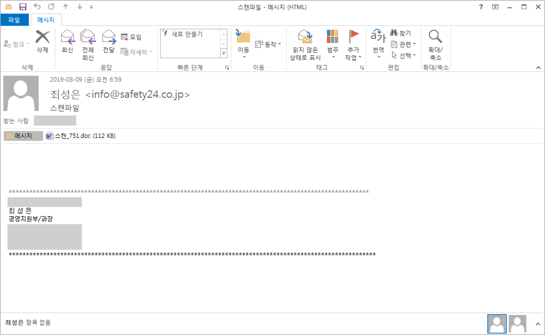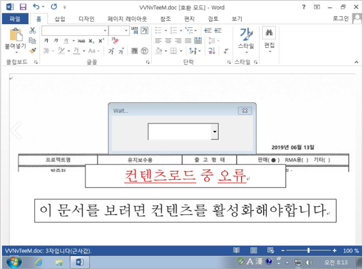 현재까지 확인 된 국내 기업을 대상으로 유포되고 있는 스팸 메일 제목은 '스캔파일' 이다. 해당 메일은 '스캔_(임의숫자).doc' 파일 이름의 Microsoft Office Word 워드 문서 파일을 첨부하고 있다. 메일 발송자는 '최성은'이며, 악성 워드 문서 내용은 '물품인수증'을 목적으로 한다. 발송자와 메일 제목 내용은 달라질 가능성이 높다. 악성 워드 문서 실행시 다음과 같은 화면이 보이며 사용자의 매크로 콘텐츠 사용 허용을 유도한다.