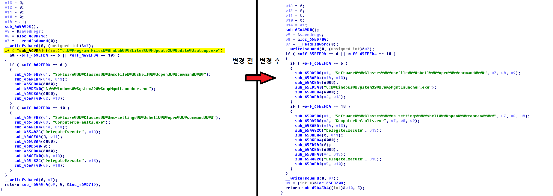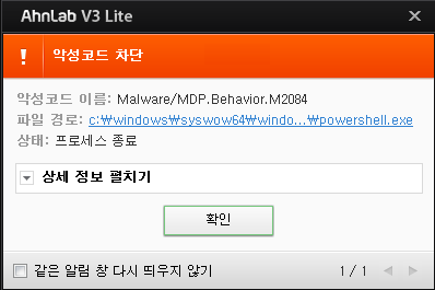 [그림 6]은 파워쉘 스크립트 내부에 인코딩된 페이로드의 일부로, 레지스트리 등록을 통한 권한 상승 기능의 코드이다. 아래 이전에 분석된 내용과 비교했을 때, V3Lite 사용 여부를 체크하는 부분이 사라졌으며, 이로 인해 V3Lite 사용자 또한 권한 상승 행위가 발현되지만, [그림 7]과 같이 자사 행위탐지로 인해 차단된다.