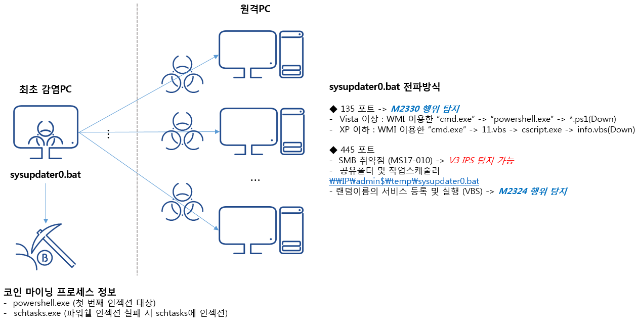 최초 감염 PC에서 “sysupdater0.bat” 파일이 실행되면 감염 PC의 시스템 운영체제에 따라 윈도우 XP일 경우, 파워쉘을 사용할 수 없음으로 외부에서 VB 스크립트 파일(*.vbs)을 다운받아 “cscript.exe”를 통해 실행하고, 윈도우 Vista 이상일 경우, 파워쉘 스크립트(*.ps1)를 다운받아 “powershell.exe”를 통해 실행한다. 두 가지 형태 모두 스크립트 형태(*.vbs, *.ps1)는 다르지만 내부 기능은 동일하며, 다운로드 받은 스크립트 내부에 인코딩(Encoding)된 코인 마이너 및 Mimikaz 해킹툴, 이터널블루 쉘코드(MS17-010)를 실행하여 피해를 줄 수 있다. 전파방식은 크게 135포트와 445포트를 통한 전파를 시도하며, 135포트의 경우 WMI 명령을 이용하여 원격지 시스템의 “cmd.exe”를 구동하여 외부 파일을 다운로드 받아 실행한다. 445포트의 경우 SMB취약점(MS17-010)을 통해 전파하는 방식과 ADMIN$ 공유폴더를 통한 전파, SMB를 통한 원격지 서비스 등록 및 구동하는 방식 3가지를 사용한다.