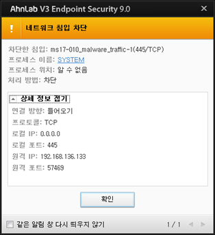 현재 안랩에서는 SMB나 WMI 프로토콜에 의해 피해 PC에서의 비정상적인 행위가 발생할 경우 아래 진단명으로 행위 탐지 및 차단 하고있다.
