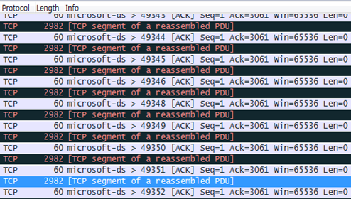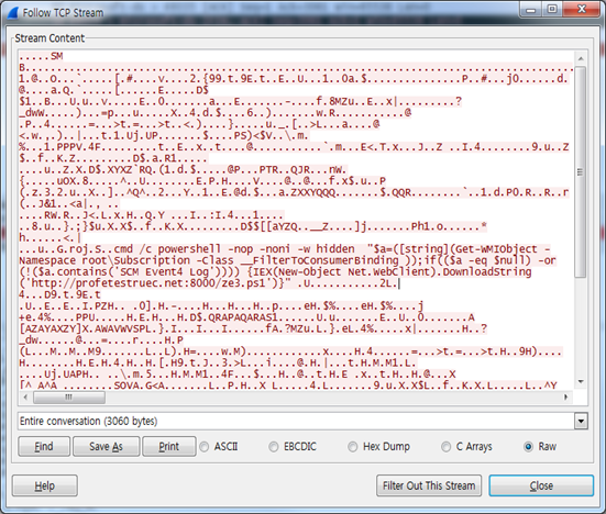 아래 [그림 9], [그림 10]은 원격PC에 이터널블루 취약점 시도 과정에서 캡처한 패킷이다. 이터널블루 취약점 발현이 성공하였을 경우 원격 PC에서 운영체제에 따라 악성 파워쉘 스크립트가 파일리스 형태로 다운로드 및 실행된다.