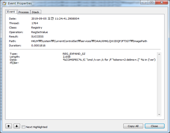 [표 2] 다운로드된 파워쉘 스크립트가 등록하는 WMI 클래스 속성