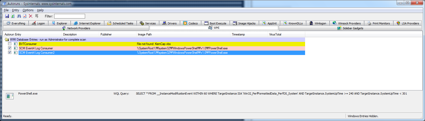 악성코드가 감염 PC에 상주하기 위해 널리 알려진 기법으로 레지스트리 Run 혹은 RunOnce 키 등에 자신을 등록하는 방법이 있다. 그러나 WannaMine의 경우에는 WMI의 이벤트 필터와 컨슈머를 설정한 뒤 필터 투 컨슈머바인딩(FilterToConsumerBinding)을 통해서 등록한 이벤트 필터와 컨슈머를 연결함으로써 재부팅 시에도 악성 파워쉘 스크립트가 동작하게 된다.