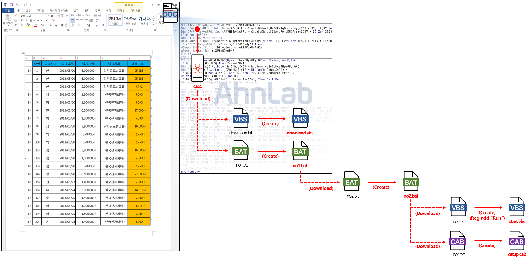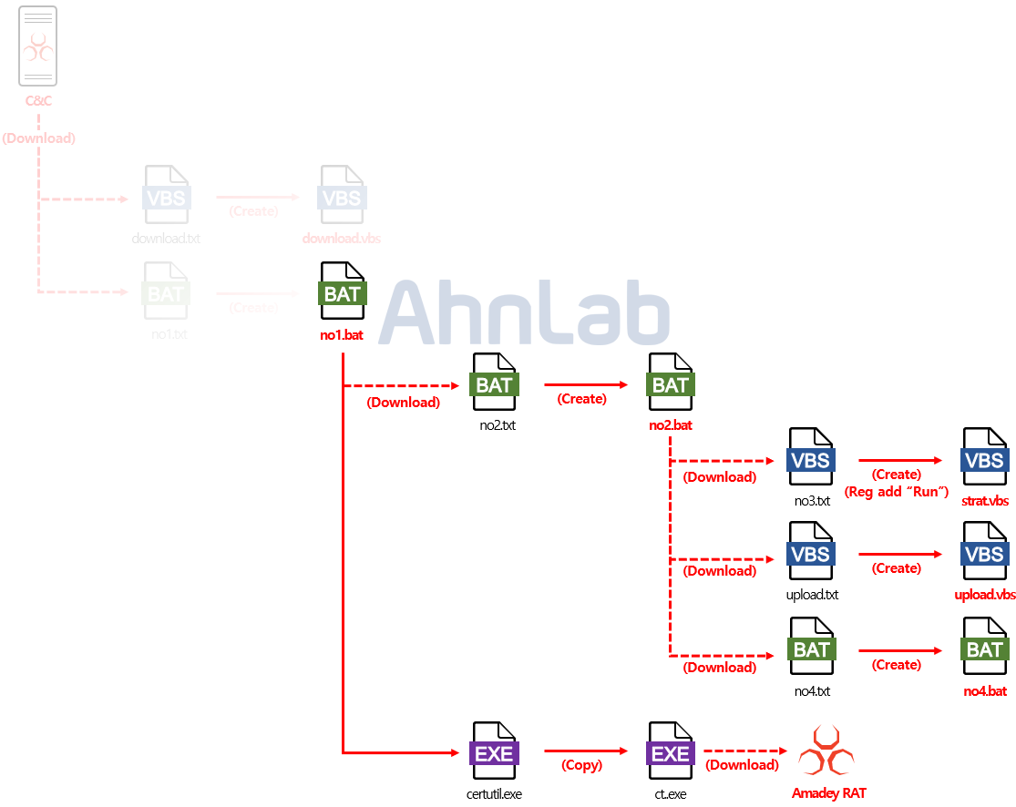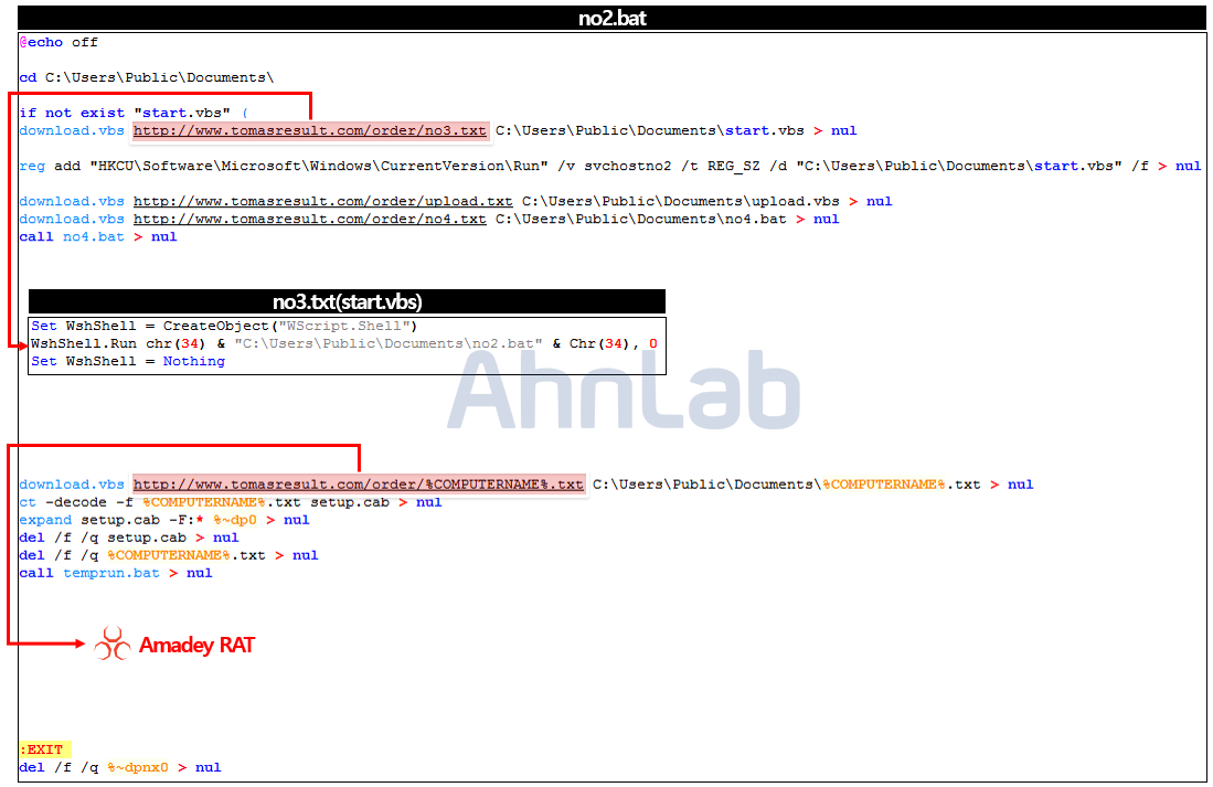 VBScript파일 'download.txt'과 배치 파일 'no1.txt'은 경로 'C:\Users\Public\Documents'에 각각 파일명 'download.vbs', 'no1.bat' 으로 생성된다.