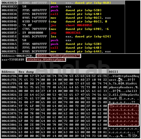 쉘코드가 실행되면 WinHttp를 이용하여 공격자의 C&C 서버에서 VBScript 파일과 배치 파일을 다운로드 한다.