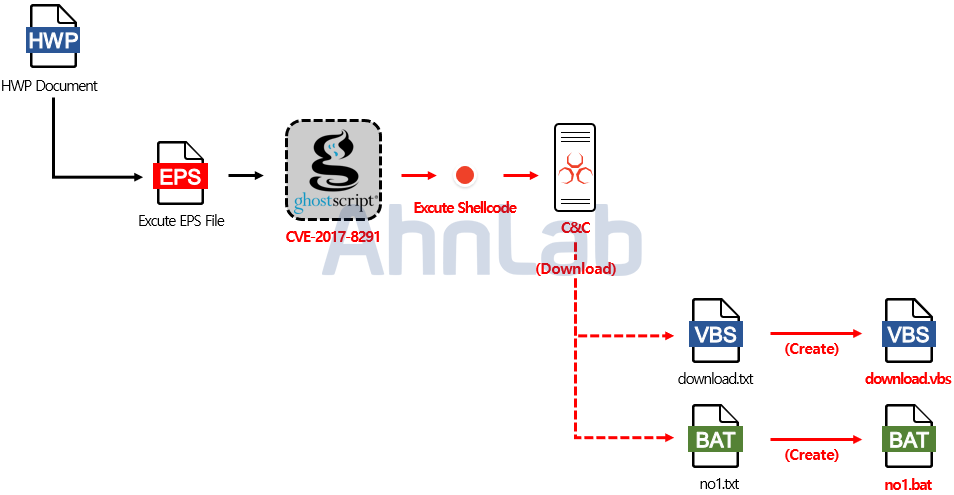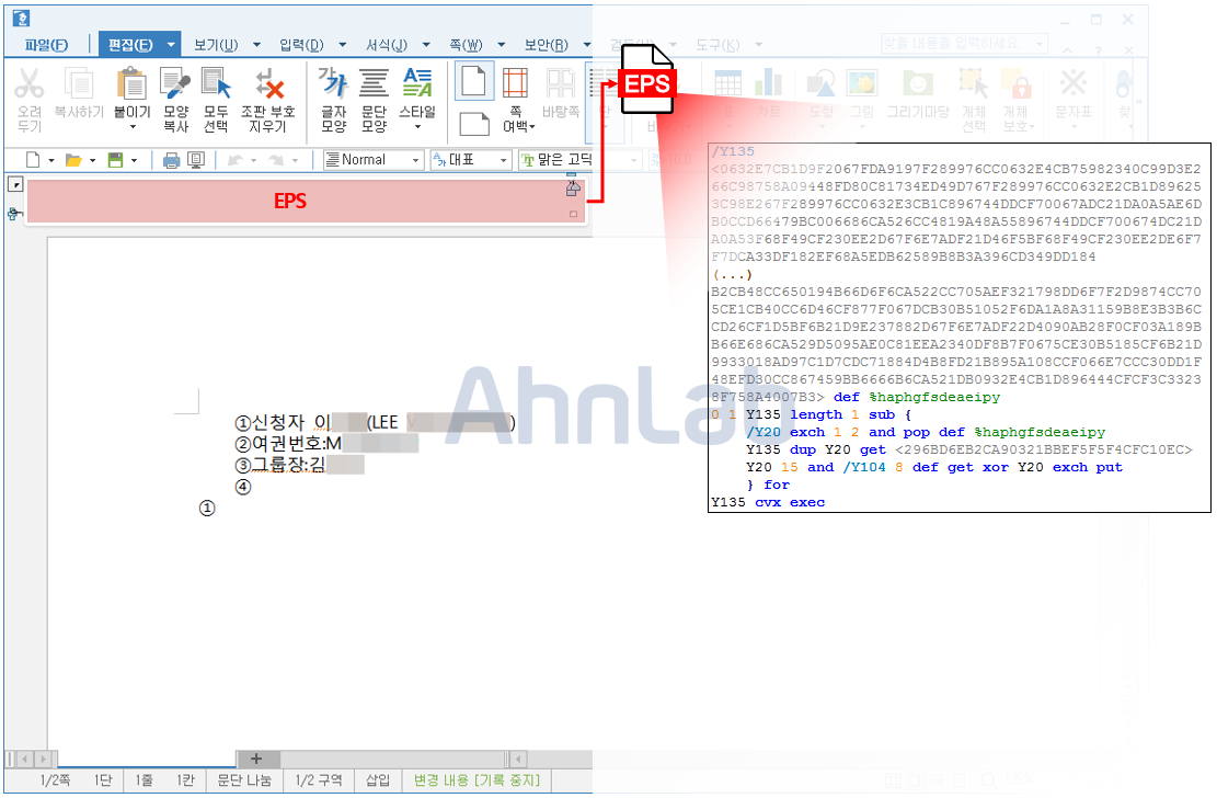 EPS파일은 다음과 같이 문서 한글 문서 파일의 여백부분에 삽입되어 있으며 이미지는 정상적으로 출력되지 않는다. 한글 프로그램에서 EPS 파일을 실행하기 위해서는 고스트 스크립트(Ghostscript)라 불리는 별도의 인터프리터 프로그램을 사용한다. 공격자는 고스트 스크립트 프로그램의 보안 취약점(CVE-2017-8291)을 이용하여 악성 코드를 시스템에 감염시켰다.