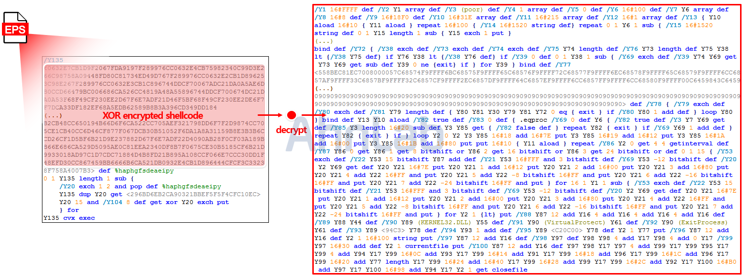 EPS파일에는 악성 행위를 수행하는 쉘코드(Shellcode)가 삽입되어 있으며 쉘코드는 XOR 연산을 통해 암호화 되어 있다.