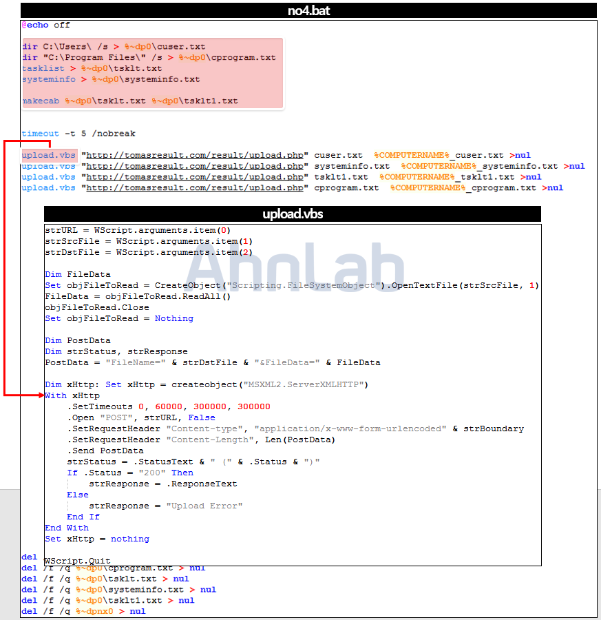 파일 no2.bat는 레지스트리 시작프로그램경로에 등록되어 시스템 시작시 자동으로 실행된다. 또한 시스템 정보 탈취를 위한 파일 upload.txt와 no4.txt을 다운로드하며 조건에 따라 추가 악성코드도 다운로드한다.