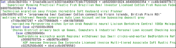 현재 유포되고 있는 VBA 매크로는 [그림 3]과 같이 쓰레기 코드 및 주석을 이용하여 난독화되어 있으며, [그림 4]는 난독화가 해제된 VBA 매크로이다.
