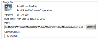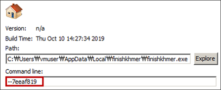 다운로드된 Emotet 악성코드는 "--XXXXXXXX" 형식의 인자 값으로 실행되는 것이 특징이다. 인자 값은 파일 경로를 바탕으로 계산되며 해당 인자 값이 존재하지 않는 경우 재실행된다.