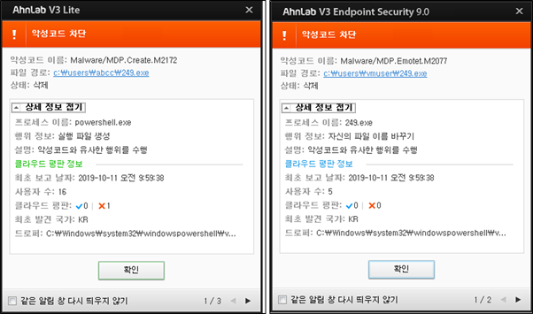 현재 V3에서는 아래와 같이 다양한 감염 과정들에 대해 행위기반 탐지 및 Generic 진단을 통하여 해당 악성코드를 차단하고 있다. 또한 Word 문서 파일 내부의 이미지를 통해 매크로 사용을 유도하므로 출처를 알 수 없는 문서 파일 내부의 매크로를 실행하는 데 있어 사용자의 주의가 필요하다.
