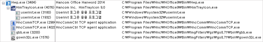- gswin32c.exe 프로세스(또는 gbb.exe 프로세스)가 한글 프로그램 실행 시 실행되는 HimTrayIcon.exe 프로세스에 쉘코드 인젝션 - RtlCreateUserThread 이용
