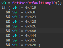 해당 랜섬웨어는 감염 전에 사용자 윈도우 설치 언어를 확인하는 코드가 존재하며, 아래와 같다.