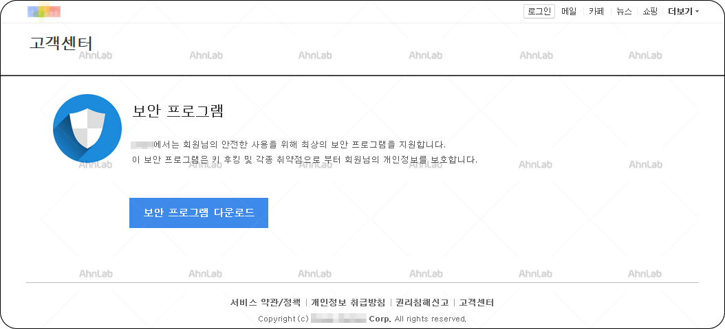 피싱 페이지는 접속한 웹 브라우저의 사용자 에이전트(User-Agent)에 따라 PC 버전과 모바일 버전으로 출력되며 공격 대상에게 보안 프로그램 또는 앱으로 위장한 악성코드의 다운로드를 유도한다.