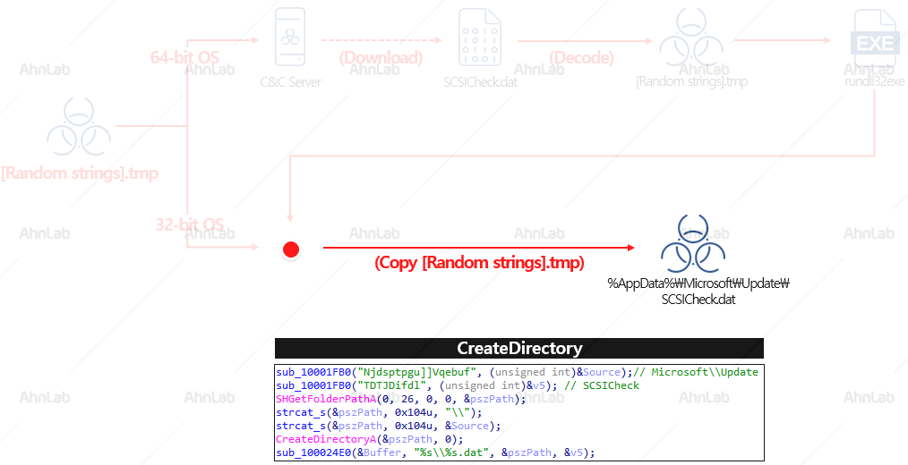 악성코드의 행위정보는 다음과 같다. 경로 '%AppData%\Microsoft\Update\SCSICheck.dat'에 파일을 자가 복제한다. 복제한 파일은 시스템 재시작 시 자동 실행하기 위해 레지스트리 경로에 등록된다.