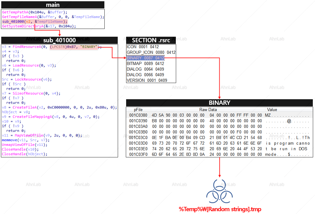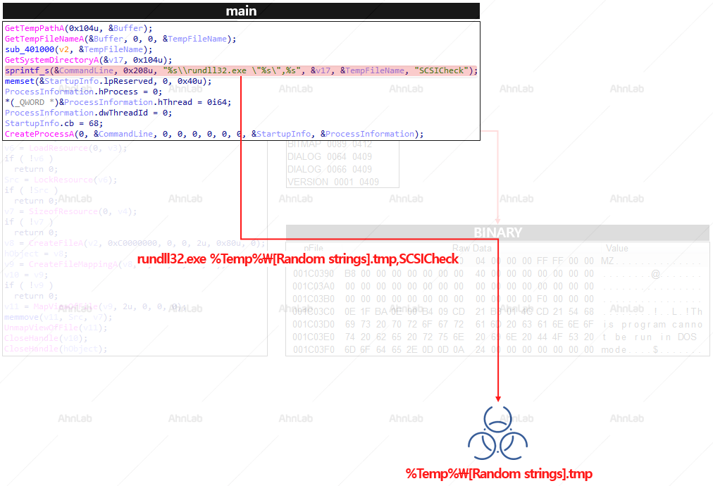 추가 악성코드는 동적 링크 라이브러리(DLL) 파일이며 Windows 호스트 프로세스인 rundll32.exe를 이용하여 DLL 내부 함수인 'SCSICheck'를 호출하여 동작한다.