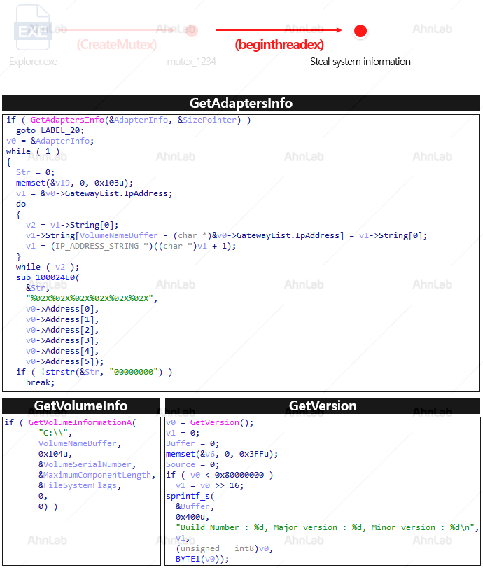 스레드가 실행되면 감염 PC의 IP주소, MAC주소, 윈도우 운영체제 버전, 드라이브 정보를 수집한다.