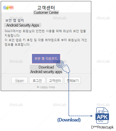 모바일 환경에서 피싱 페이지에 연결하였다면 '보안 앱 다운로드' 버튼이 출력되며 버튼을 클릭하면 애플리케이션 'D***Protect.apk'가 다운로드된다.