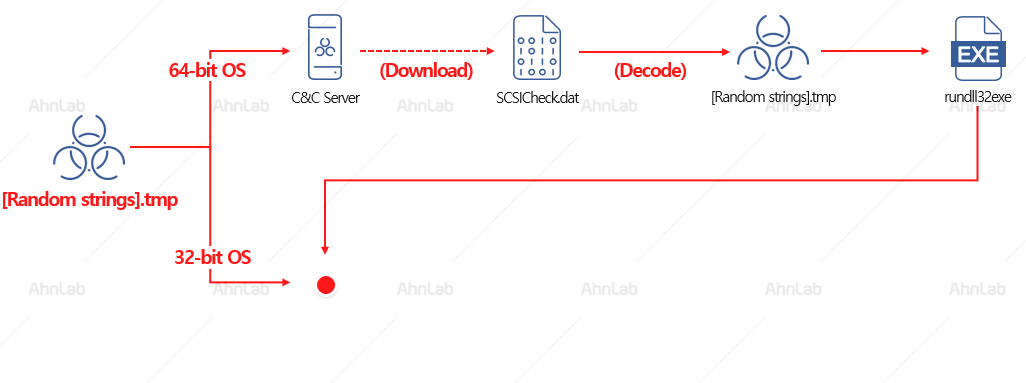 추가 악성코드가 실행되면 시스템의 운영체제 정보를 확인한다. 운영체제가 64-bit인 경우 C&C서버로부터 64-bit용 악성코드를 다운로드한다. 다운로드된 악성코드를 복호화하여 이전과 마찬가지로 rundll32.exe를 이용해 호출한다.