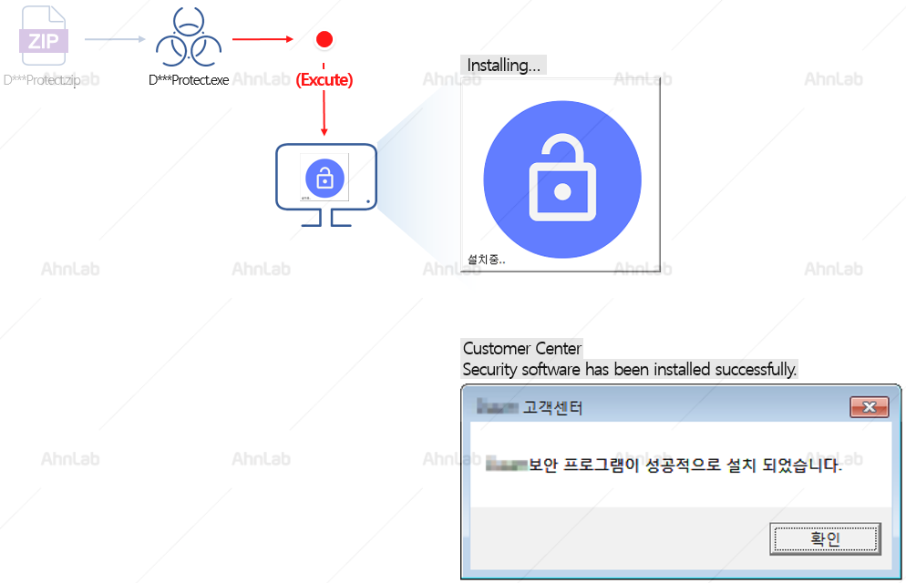 실행파일 'D***Protect.exe'은 드로퍼(Dropper)이며, 파일을 실행하면 보안 프로그램이 설치로 위장한 대화 상자(Dialog)를 출력하여 사용자의 의심을 피하고자 한다.