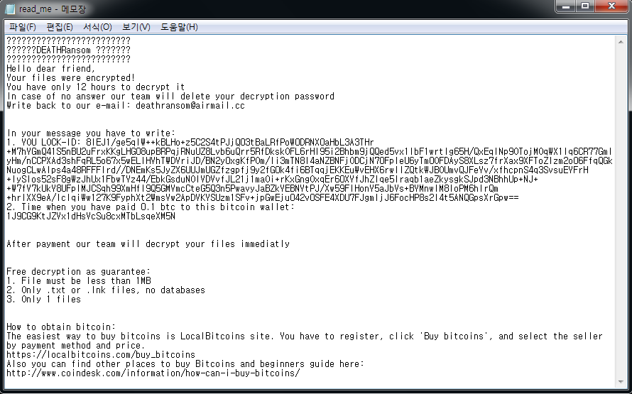 DEATHRanom 랜섬웨어는 아래 폴더와 파일을 제외하고 모두 감염 대상이다. 감염 후 확장자 변경은 하지 않고, 감염을 한 폴더마다 랜섬노트인 "read_me.txt" 파일을 생성한다.