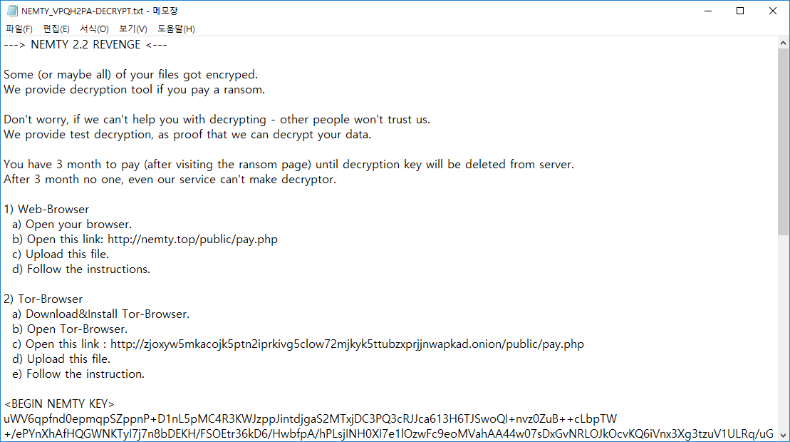 2019년 12월 02일 ASEC 분석팀은 NEMTY 랜섬웨어 버전이 2.0에서 2.2로 업데이트 되어 유포된 것을 발견하였다. '이력서' 또는 '부당 전자상거래 위반행위 안내' 로 위장한 유포방식을 포함해 감염제외 국가, 감염 대상, 감염 제외 파일, 폴더 모두 기존 NEMTY REVENGE 2.0과 동일하다.