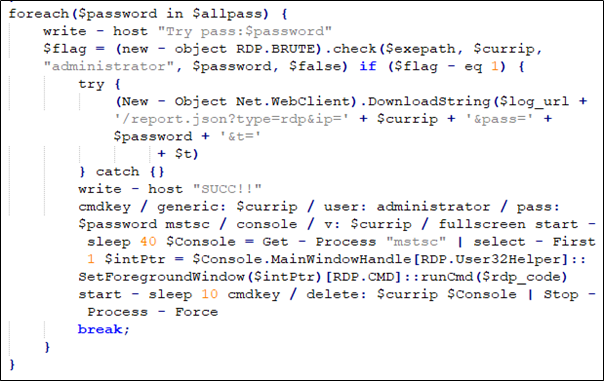 미미카츠 모듈을 다운로드했던 URL에서 freerdp 모듈도 다운로드하고, 이를 이용해 RDP 무차별 대입 공격을 수행한다. RDP 기본 포트인 3389을 이용하여 열린 서버를 탐색 후 “관리자(Administrator)” 계정명으로 로그인을 시도한다. 이때 [표 7]의 하드코딩된 비밀번호를 사용한다.