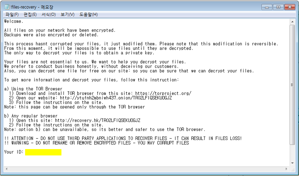 해당 랜섬웨어의 랜섬노트와 주요 기능은 다음과 같다.