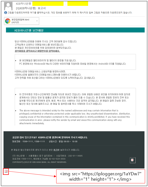아래 그림은 수신되는 메일의 내용과 HTML 실행시의 화면들이다. 메일 하위에는 이미지를 삽입해야하는 img 태그에 이미지가 아닌 특정 주소를 삽입해두었는데, 웹 비콘으로 IP주소 및 추적 서비스이다. 따라서 메일 수신인의 IP를 확인 할 수있다.