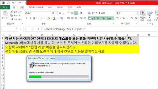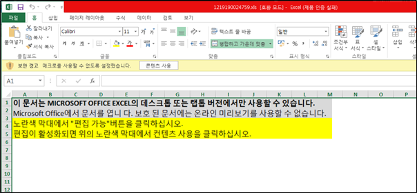 다운로드 받아진 악성 엑셀 문서를 실행하면 다음과 같은 화면을 볼 수 있으며, 사용자가 매크로를 허용하도록 유도한다. 매크로 허용 시 내부에 포함된 악성 매크로가 실행된다.