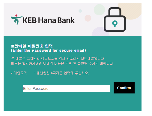 12월 20일 국내를 대상으로 다운로더 악성코드를 유포하는 스팸메일이 유포되고 있어 사용자의 주의가 필요하다. 해당 HTML 파일 실행 시 다음과 같이 국내 은행을 사칭한 화면을 볼 수 있다. 패스워드로 생년월일 6자리를 입력하게 되어있지만, 공백을 제외한 아무 문자나 입력 가능하다. 패스워드 입력 후 Confirm 버튼을 클릭하면 악성 매크로가 포함된 엑셀 파일이 다운로드된다.