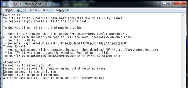 랜섬노트에는 랜섬웨어 제작자와 채팅할 수 있는 주소가 존재하며, 파일 감염시 확장자는 랜섬노트에 존재하는 랜덤값으로 변경된다.